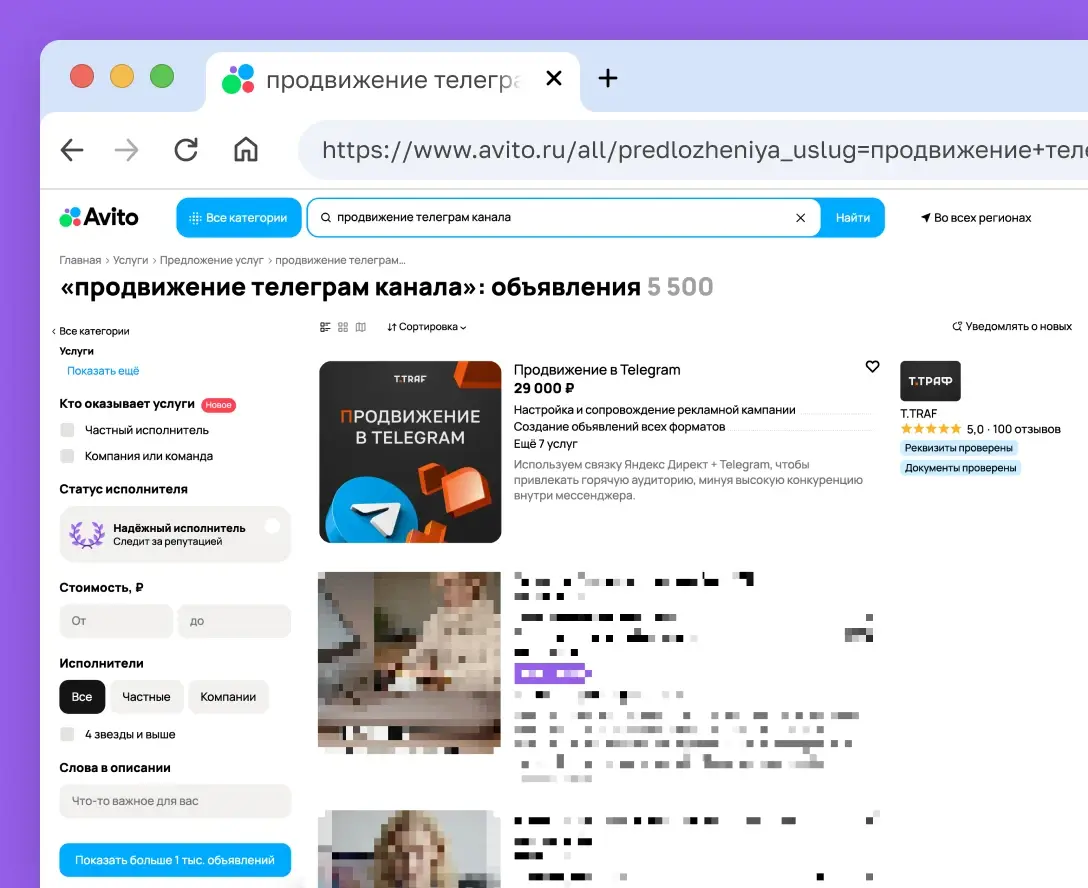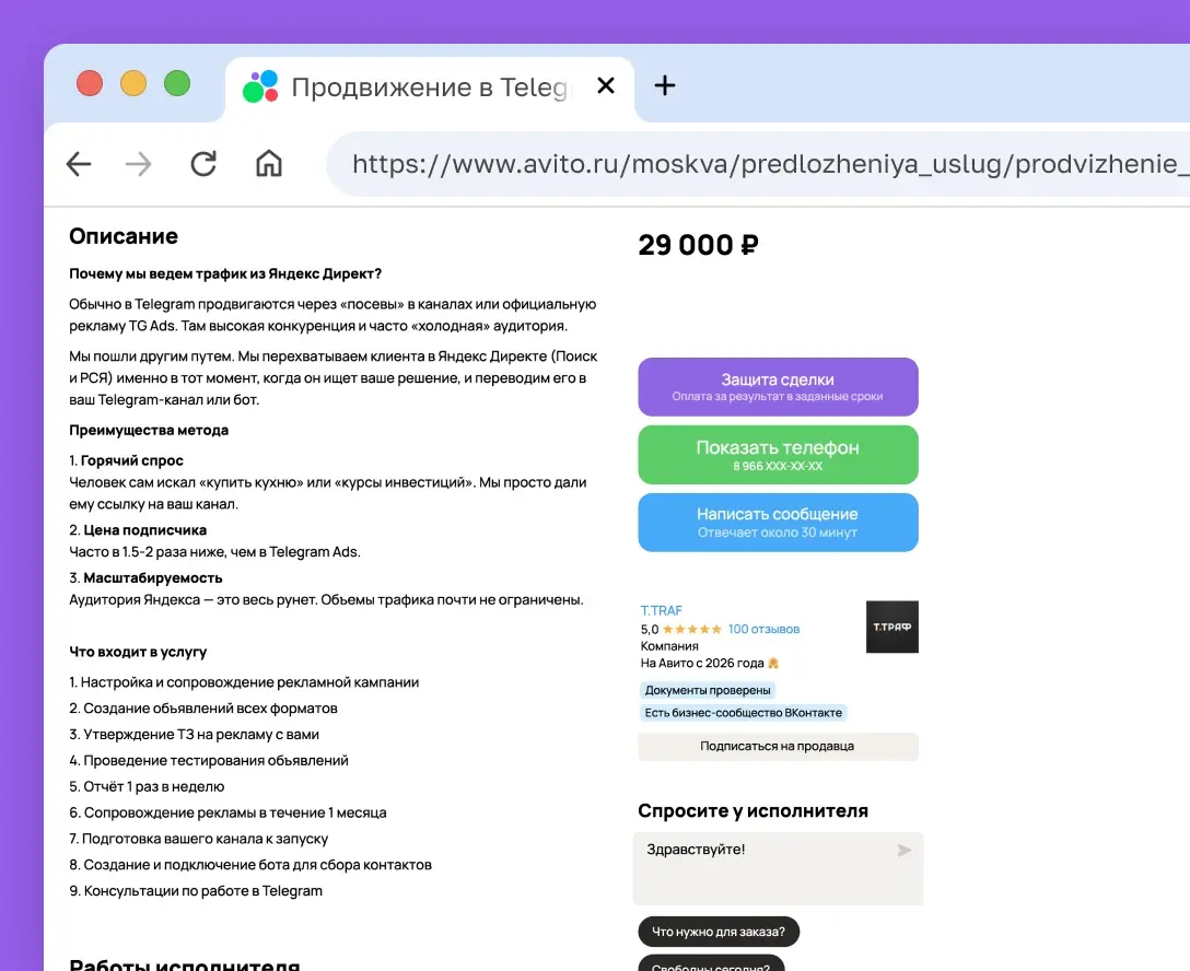 Авито — крупнейшая площадка объявлений в России. Миллионы людей каждый день ищут здесь товары и услуги. Но конкуренция огромна: плохо оформленные объявления просто не замечают. Мы знаем, как выделить вас среди тысяч конкурентов — правильный визуал, цепляющие тексты, грамотная структура. Мы не просто размещаем объявления, а выстраиваем систему, которая стабильно приносит заявки.