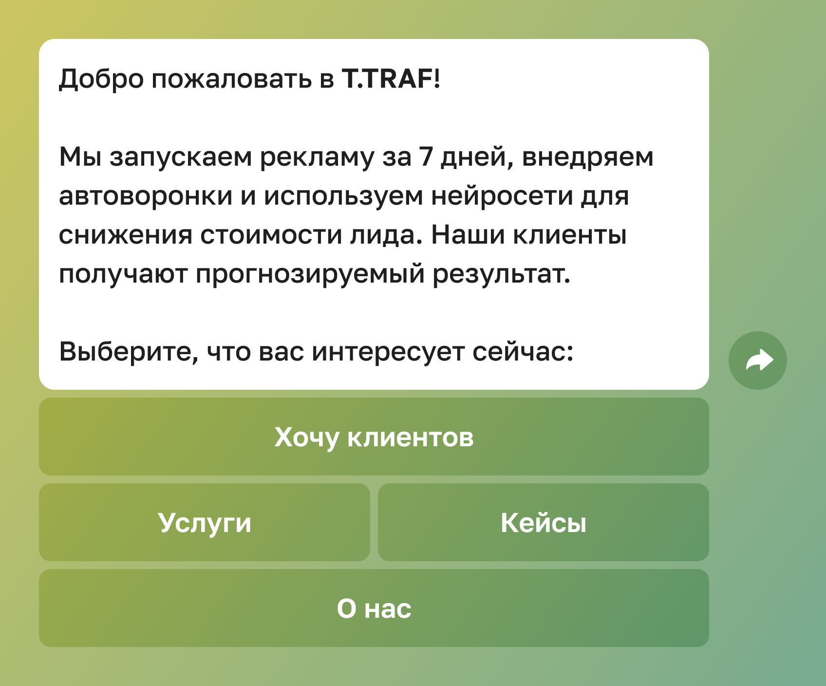 Разрабатываем чат-ботов, которые заменяют сайты и менеджеров. Удобное меню, каталог услуг и автоворонка продаж — внутри Telegram, без долгих загрузок и сложной верстки.